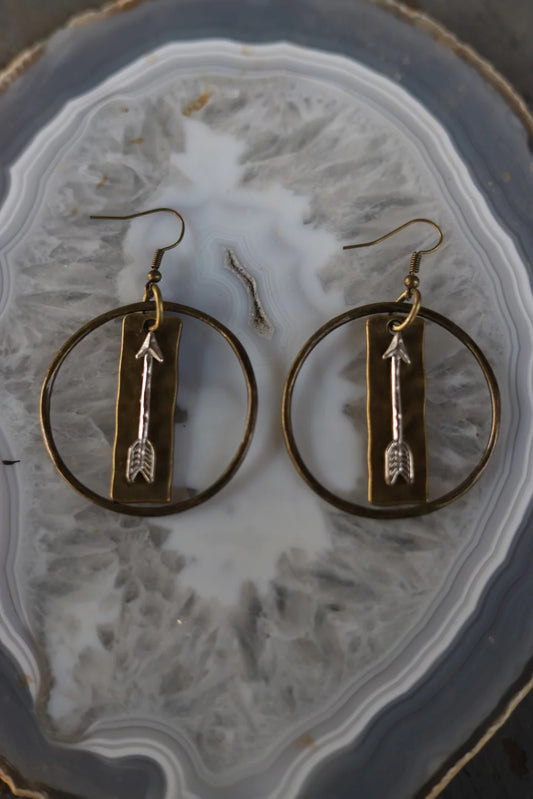 Antiqued gold hoop earrings with hammered bar and silver arrow