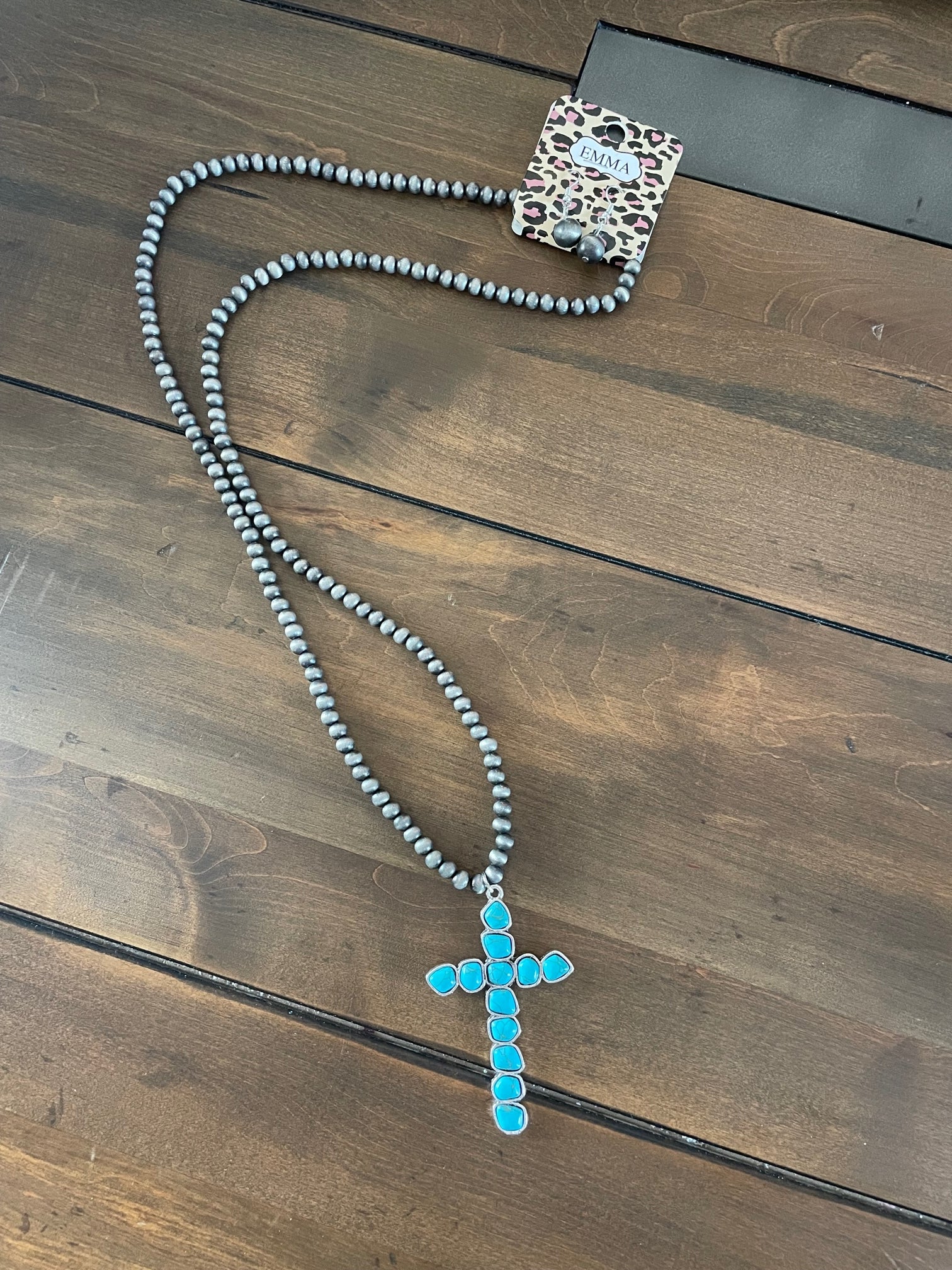 Beaded cross pendant 3" in length on a 32" beaded chain with matching earrings