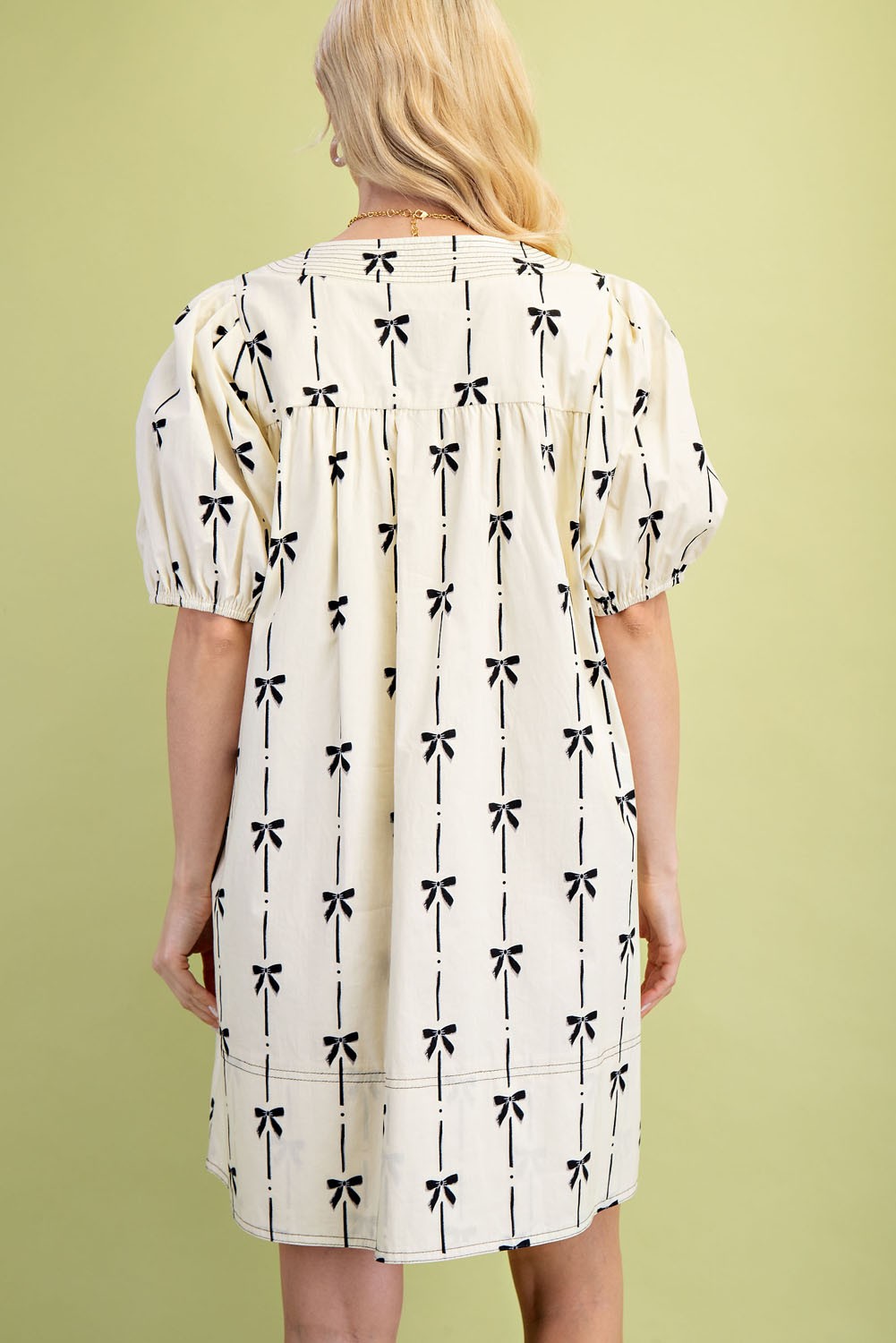 This fun dress features the cutest bow pattern, balloon sleeves and rounded neckline!! Sweet and feminine!!