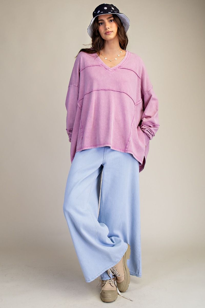 Our dusty rose shark bite V-neck top has really cute exposed raw hems and a fun A line shape!!! This top is fun and easy to wear!!