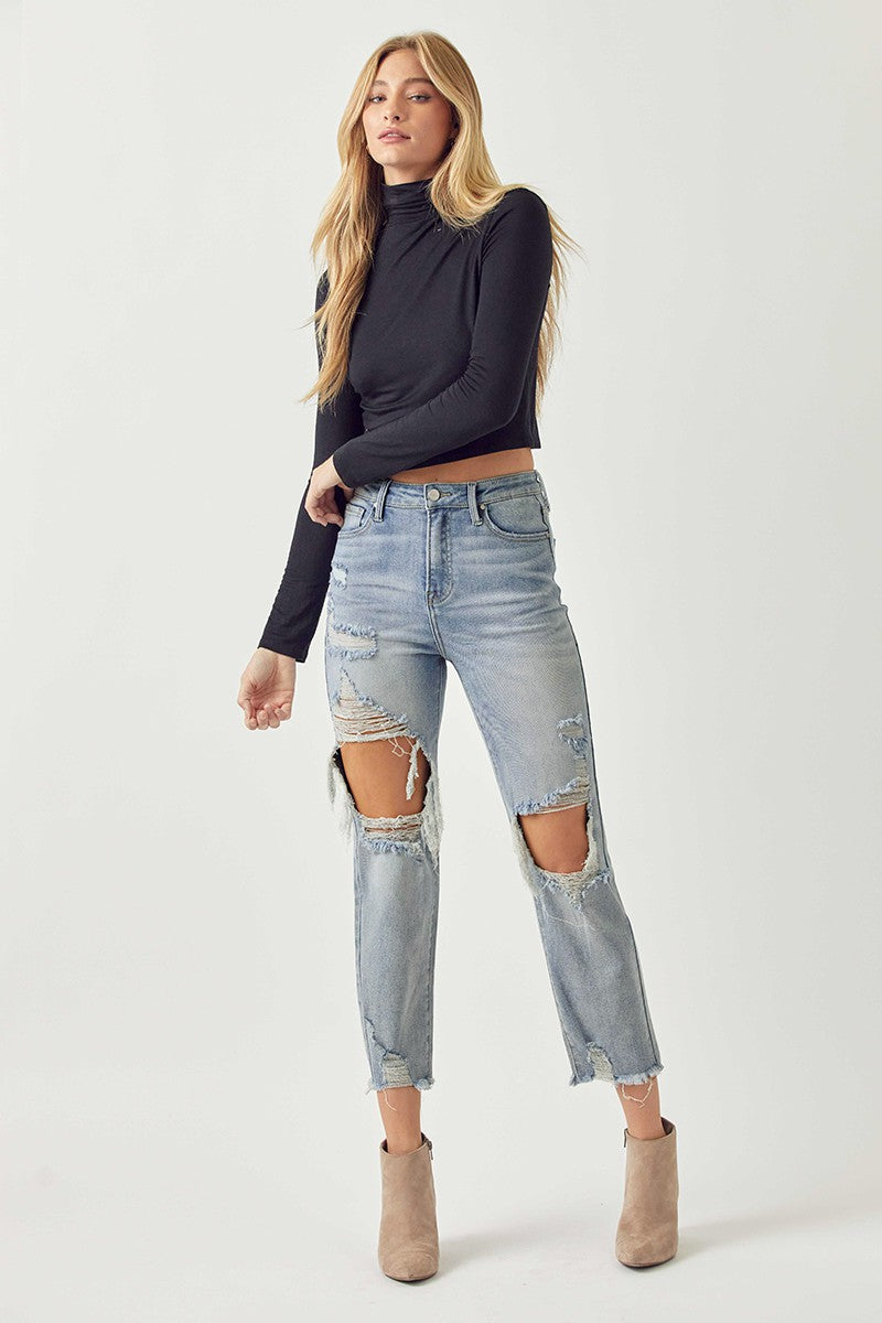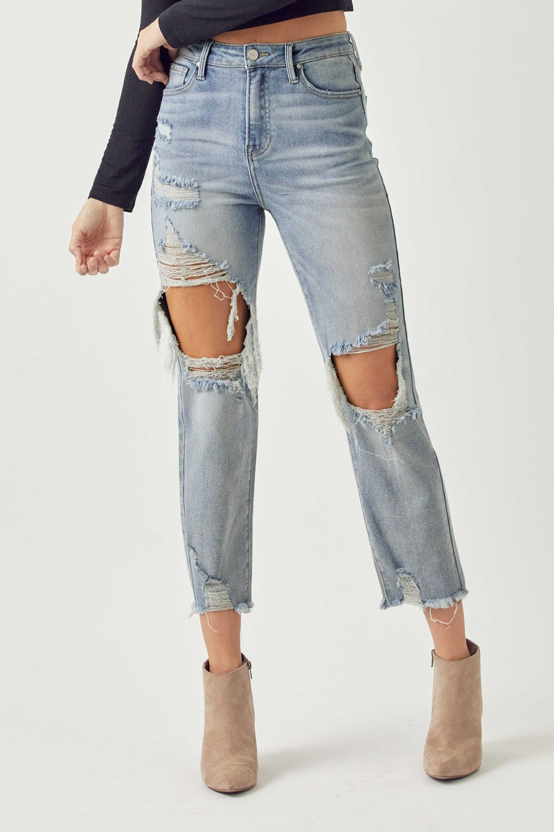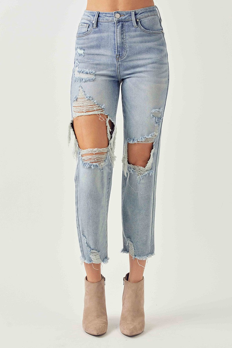 Our Gemma Jeans are a high rise straight jean highly distressed in the thigh and the knee. These are a medium/light wash. They are gorgeous!!
