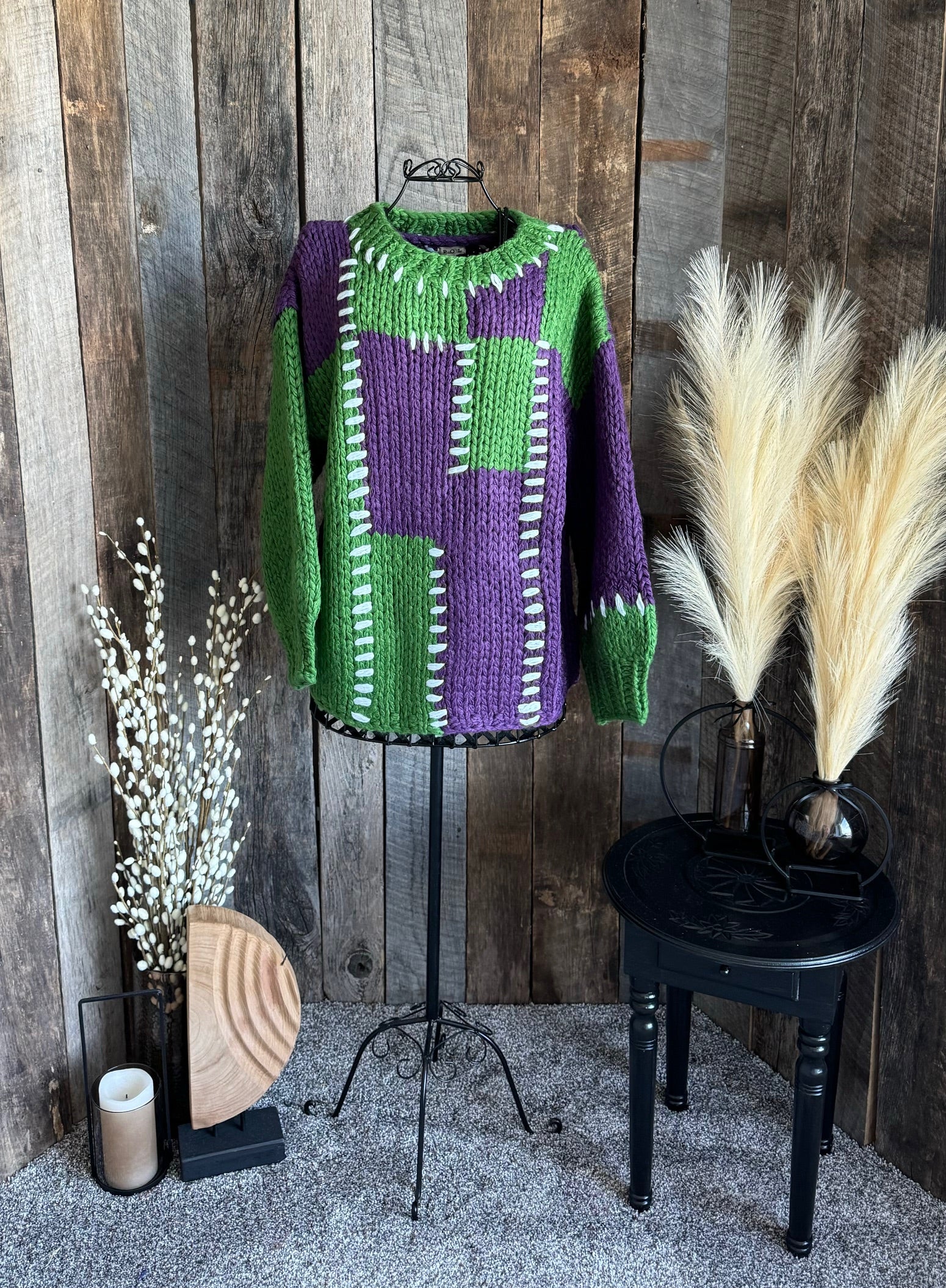 This adorable color block sweater is hand made and would be perfect for Mardi Gras!! The bright colors are so fun and the contrast stitching makes it cut and unique!!