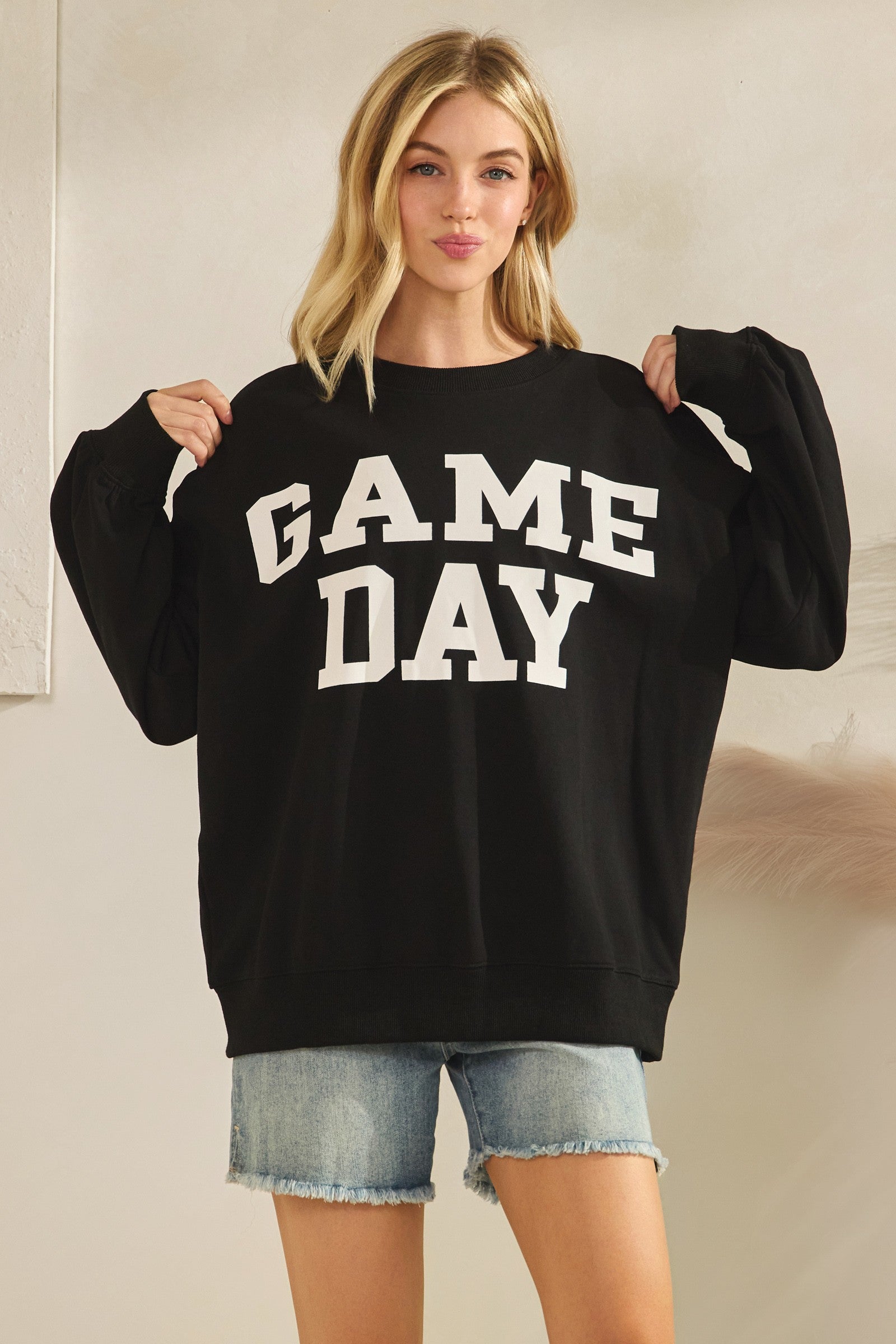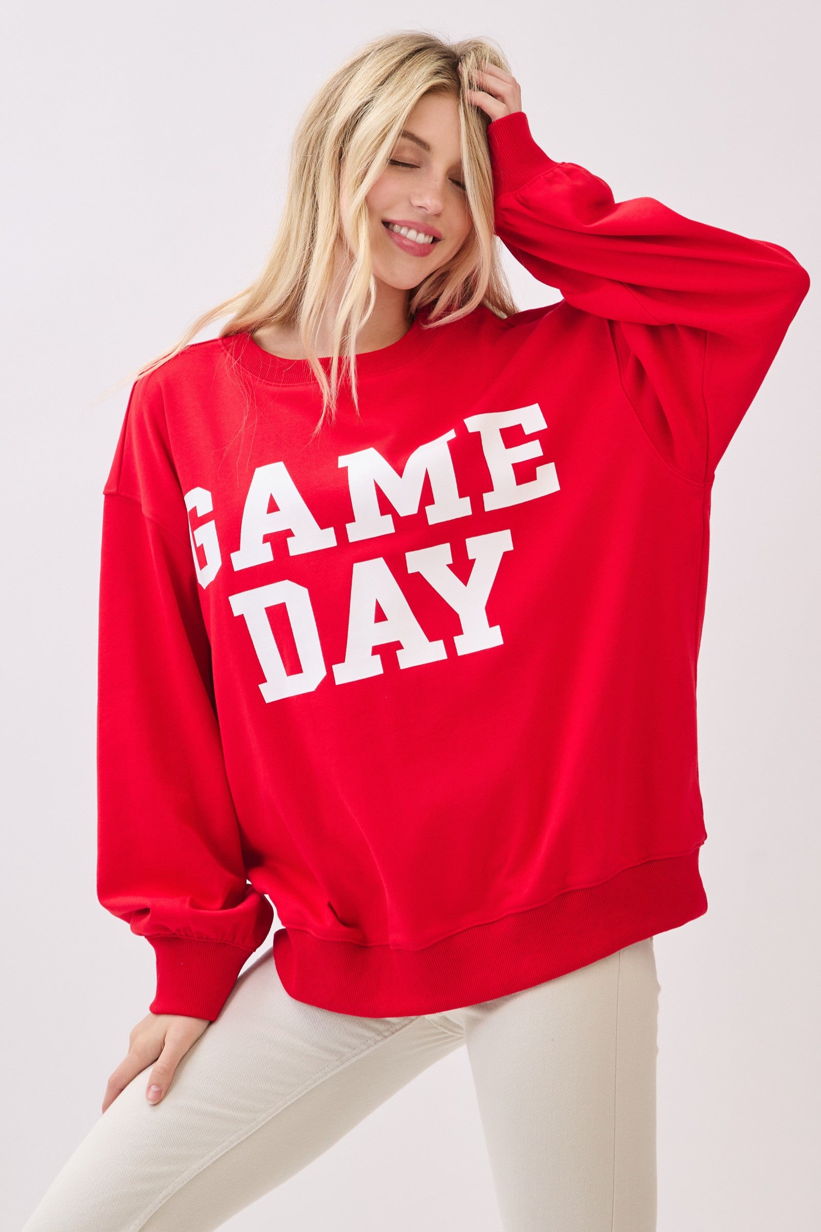 Designed for comfort and team spirit, this oversized crewneck features a bold "GAME DAY" graphic in varsity block lettering that pops. Made with soft, mid-weight fleece, it's perfect for layering over your favorite jeans or leggings. Whether you're tailgating or cozying up on the couch, this sweatshirt brings the energy of game day wherever you go!!!