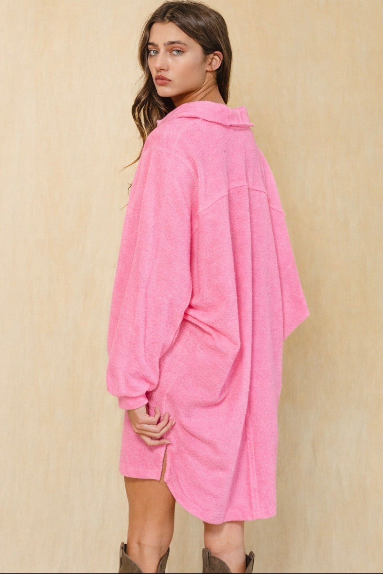 This fun reversed terry dress is cute, comfy and trendy!!! The softest fabric; collar, button down and buttoned pockets in the prettiest color of pink!!