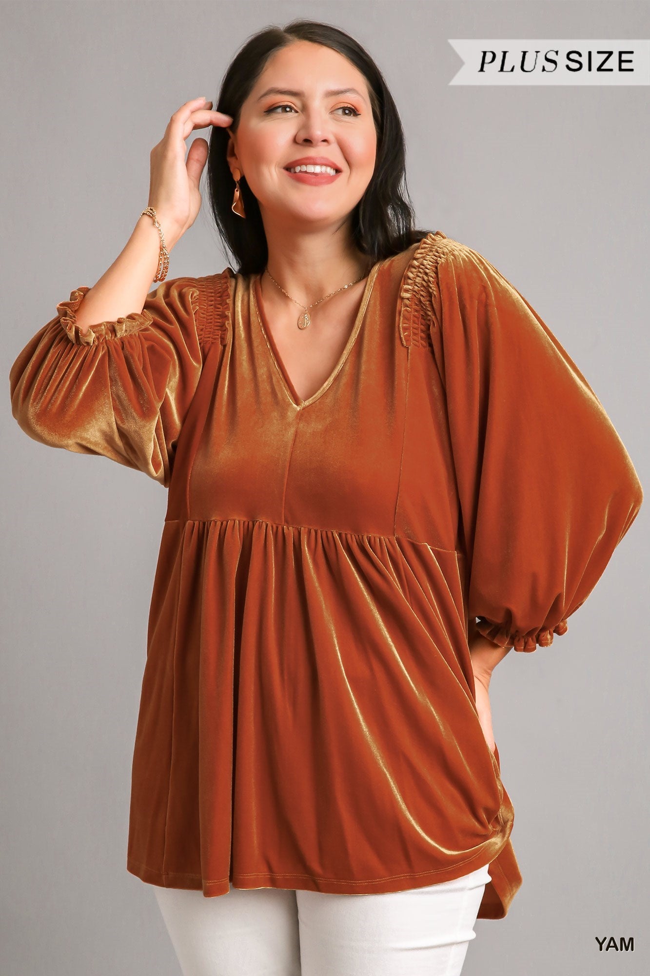 This velvet babydoll top has a high-low hem; v-neckline; smocked details; ruffled shoulders and pretty ballon sleeves with elastic bottom. The color of this gorgeous and perfect for fall and the holidays!! This one would be so cute with leggings or jeans!!